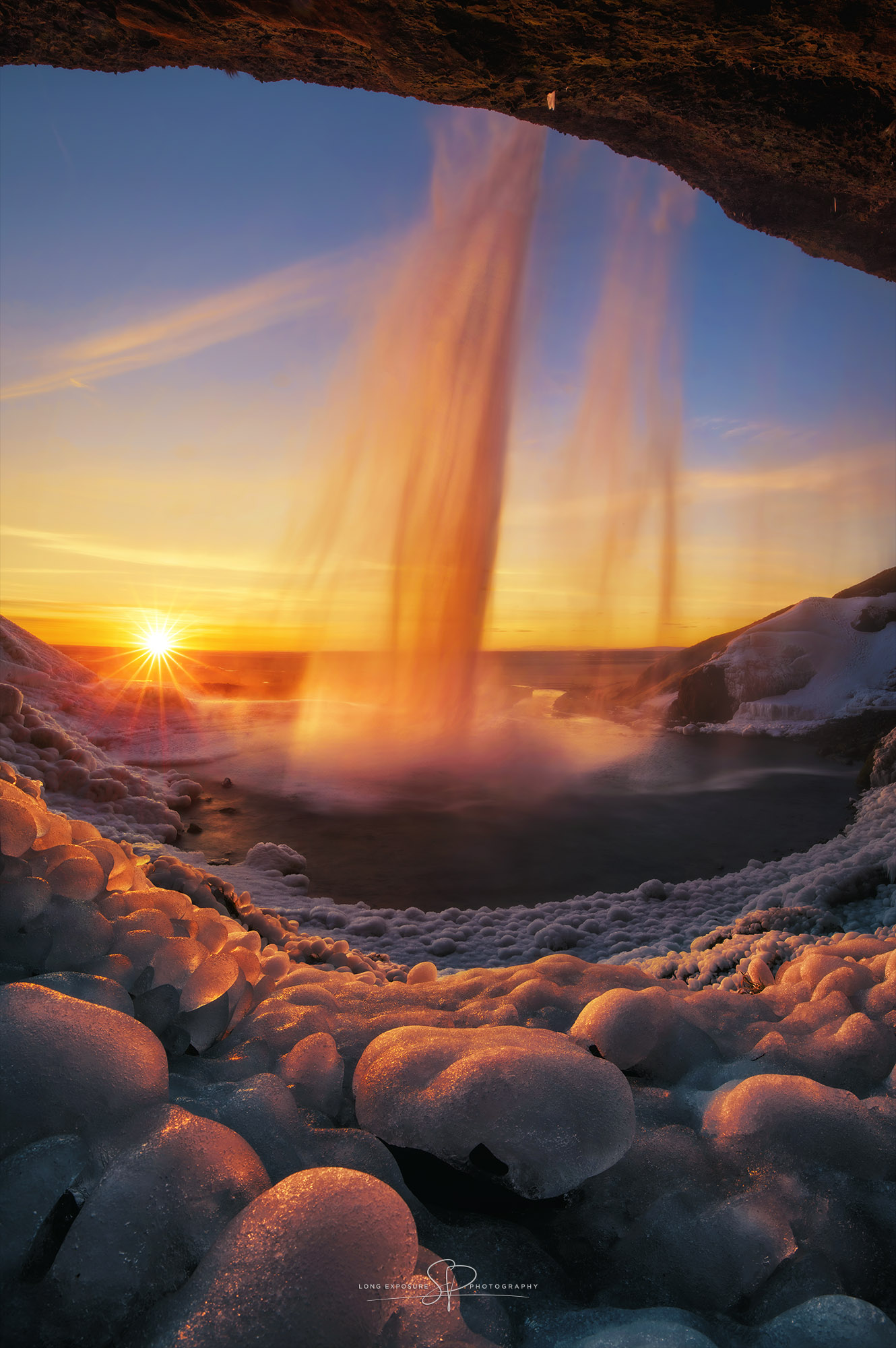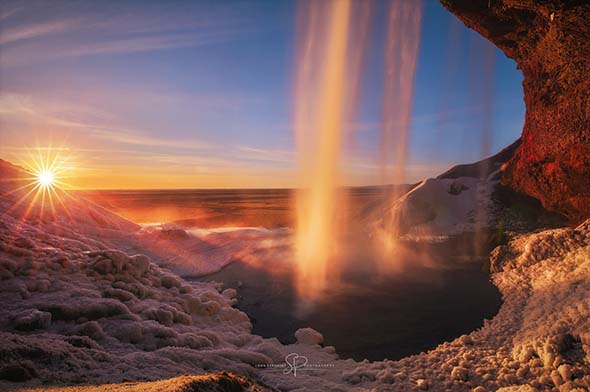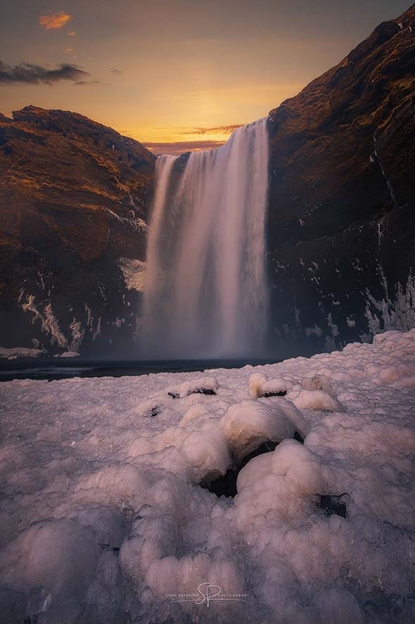 Seljalandsfoss icy sunset